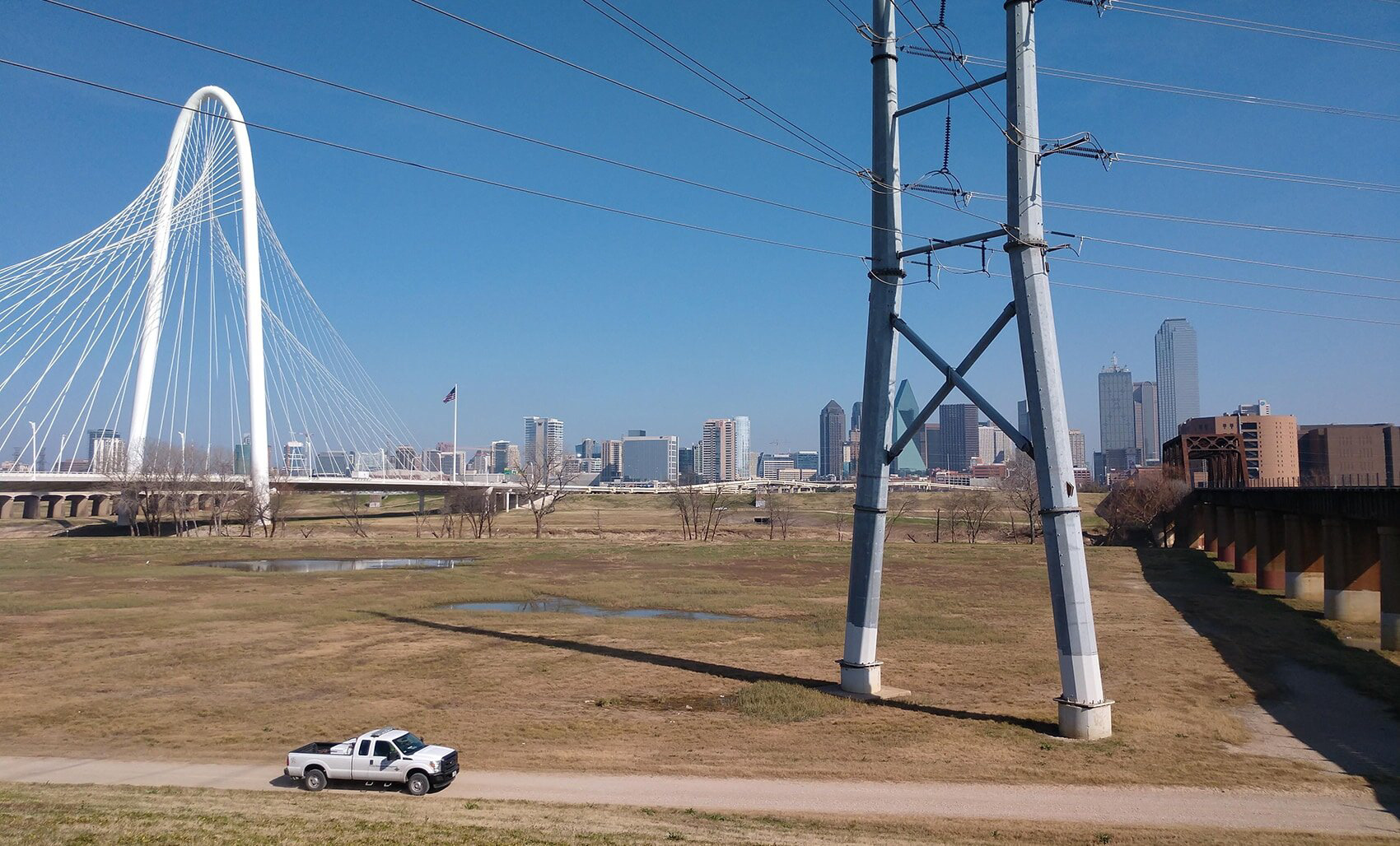 We dropped off the trailer at a local uHaul place and used the truck as our transportation for day. Instead of taking a chance on a train downtown, we walked to a thousand acre drainage park east of town. It was wide open and green. The only patch of green on Google Maps. It was beautiful in an ugly, Dallas sorta way.